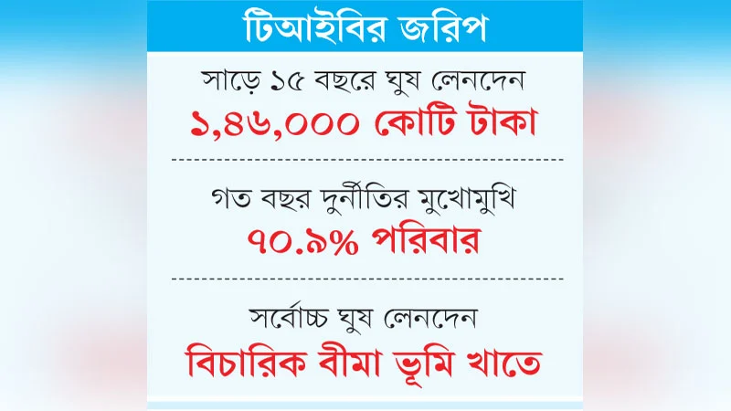 গতকাল মঙ্গলবার ট্রান্সপারেন্সি ইন্টারন্যাশনাল বাংলাদেশ (টিআইবি) প্রকাশিত ‘সেবা খাতে দুর্নীতি; জাতীয় খানা জরিপ ২০২৩’ শীর্ষক প্রতিবেদনে এসব তথ্য উঠে এসেছে। রাজধানীর ধানমন্ডির মাইডাস সেন্টারের টিআইবি কার্যালয়ে সংবাদ সম্মেলনের মাধ্যমে এ খানা জরিপের ফল প্রকাশ করা হয়।