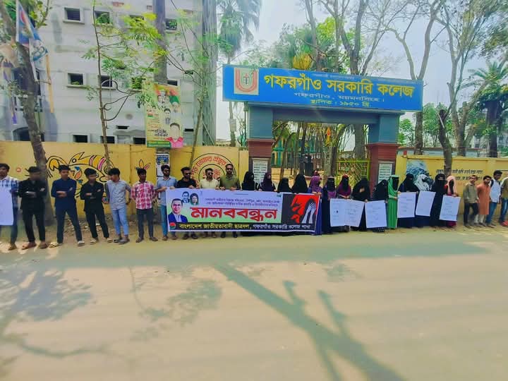 নারী ও কন্যাশিশুদের ওপর সহিংসতা এবং ধর্ষণের বিরুদ্ধে প্রতিবাদ জানিয়ে মানববন্ধন কর্মসূচি পালন করেছে গফরগাঁও সরকারি কলেজ শাখা জাতীয়তাবাদী ছাত্রদল। ধর্ষকদের সর্বোচ্চ শাস্তি নিশ্চিত করার দাবিতে সোমবার (১০ মার্চ) দুপুরে কলেজের সামনে ঘণ্টাব্যাপী এ মানববন্ধন অনুষ্ঠিত হয়।