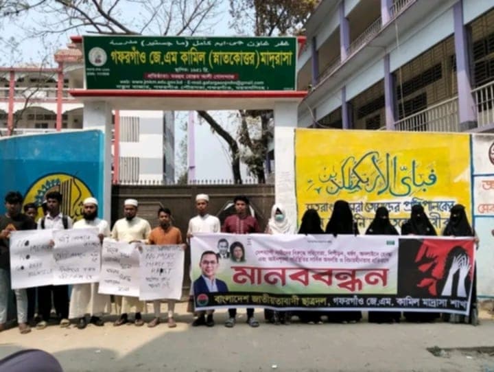 দেশব্যাপী নারীদের বিরুদ্ধে সহিংসতা, নিপীড়ন, ধর্ষণ, অনলাইনে হেনস্তা এবং ক্রমবর্ধমান বিচারহীনতার প্রতিবাদে জে এম কামিল মাদ্রাসা ছাত্রদলের উদ্যোগে এক মানববন্ধন অনুষ্ঠিত হয়েছে। বাংলাদেশ জাতীয়তাবাদী ছাত্রদল (বিএনপি ছাত্রসংগঠন) কেন্দ্রীয় সংসদের কর্মসূচির অংশ হিসেবে এ মানববন্ধন আয়োজন করা হয়।