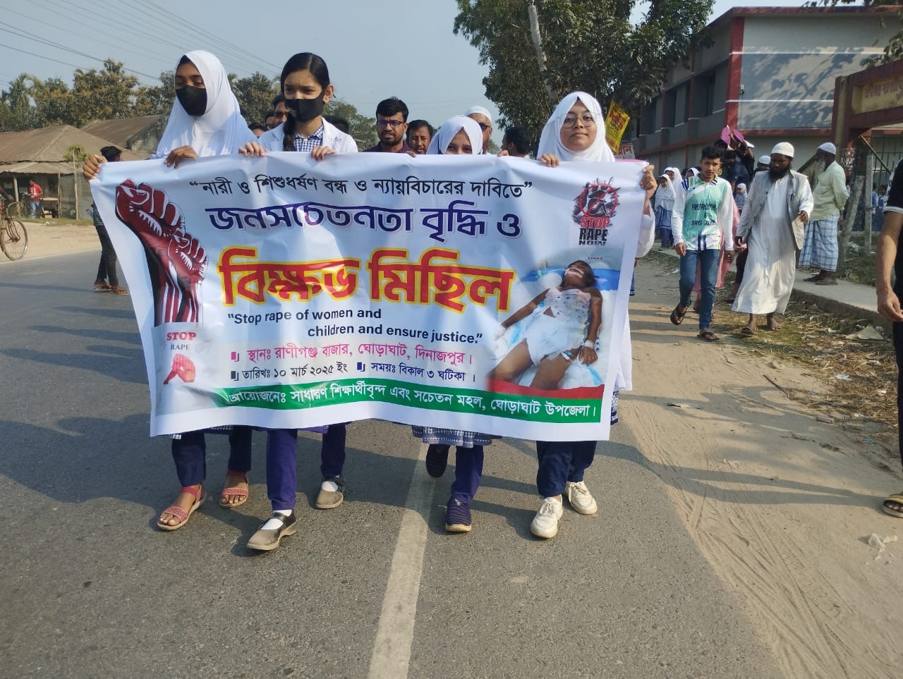 অপরদিকে, দেশব্যাপী সকল ধর্ষণের বিচার ও ধর্ষকদের সর্বোচ্চ শাস্তির দাবিতে দিনাজপুরের ঘোড়াঘাটে বিক্ষোভ মিছিল করেছে সাধারণ শিক্ষার্থীরা।