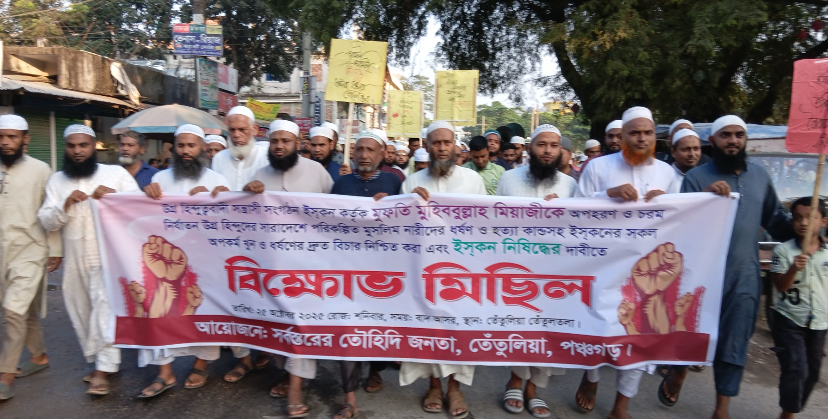 তেঁতুলিয়ায় মুফতি মুহিববুল্লাহ মিয়াজীকে অপহরণ ও নির্যাতনের প্রতিবাদে বিক্ষোভ করেছে তৌহিদী জনতা
